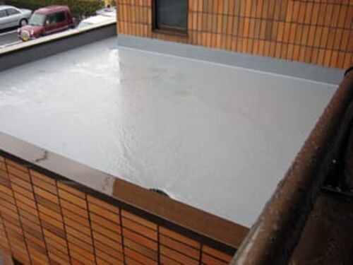 画像:FRP防水、既に入り隅にひび割れ、シール材で補修されています。 ドレン付近の入り隅の補修箇所が見えますか?(現況) その後、このバルコニーは、ウレタン防水材を使用し、防水改修をしました。 もちろん、雨漏り保証10年の保証書を発行しています。 …
